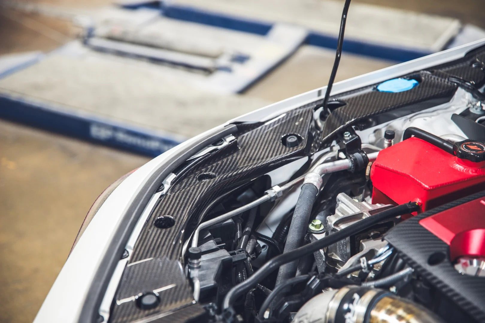 Constructed using high-temperature and high-pressure pre-preg carbon fiber production for strength and durability under elevated engine bay temperatures. -
